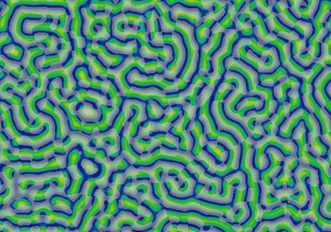 These images and movie demonstrate the behavior of the Gray-Scott reaction-diffusion system with σ=Du/Dv=2 and parameters F=0.0300, k=0.0570.