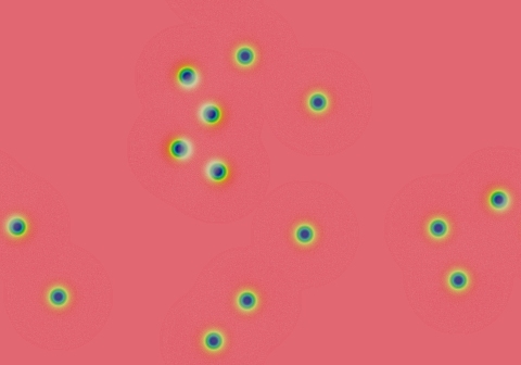 Solitons "pulse" about 8 or 9 times (with a period of about 210 tu) before reaching the visible limit of ±3×10-6. Any close pairs drift apart very slowly; drift speed diminishes exponentially with distance.