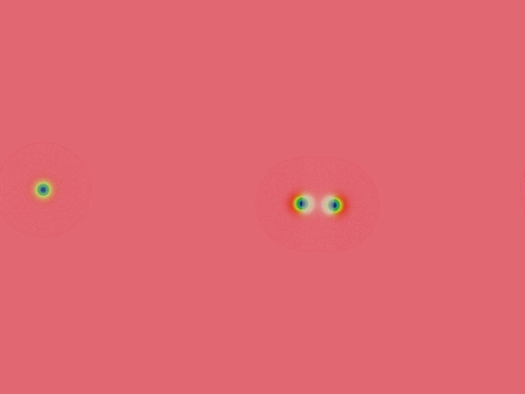 Solitons pulse about 7 or 8 times before reaching the visible limit of ±3×10-6. Close pairs repel very slowly; drift speed diminishes exponentially with distance.