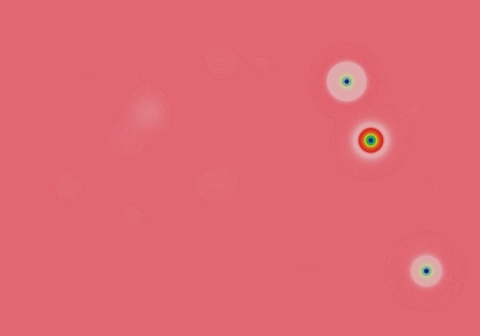 These images and movie demonstrate the behavior of the Gray-Scott reaction-diffusion system with σ=Du/Dv=2 and parameters F=0.0500, k=0.0710.