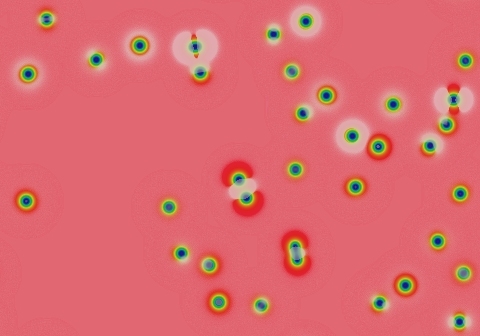These images and movie demonstrate the behavior of the Gray-Scott reaction-diffusion system with σ=Du/Dv=2 and parameters F=0.0580, k=0.0670.