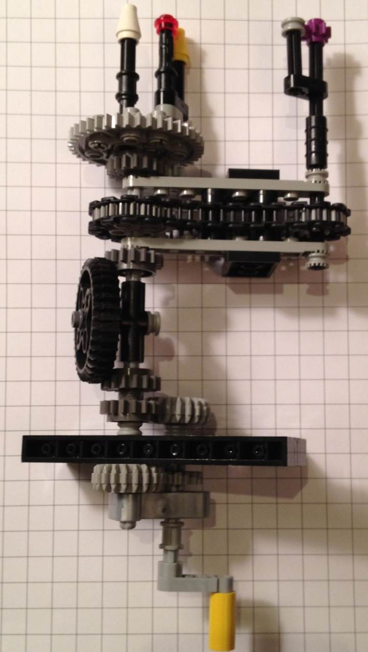 The crank also turns a 20-tooth gear, that drives a pair of dark-gray gears. All the dark gray gears in the photo are part 6542, the 16-tooth gear with a round center, and they are free to turn independently of the axle.