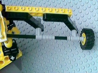 There are three "legs", each with a backbone consisting of two yellow 1x16 beams. Each leg is connected to the other two via cross-braces, which are black 1x12 beams. Each leg also supports a motor which directly (no gears) drives a wheel located at the bottom of the leg. Except for the RCX, the minifig "driver" and other decorations, the model is completely symmetrical.