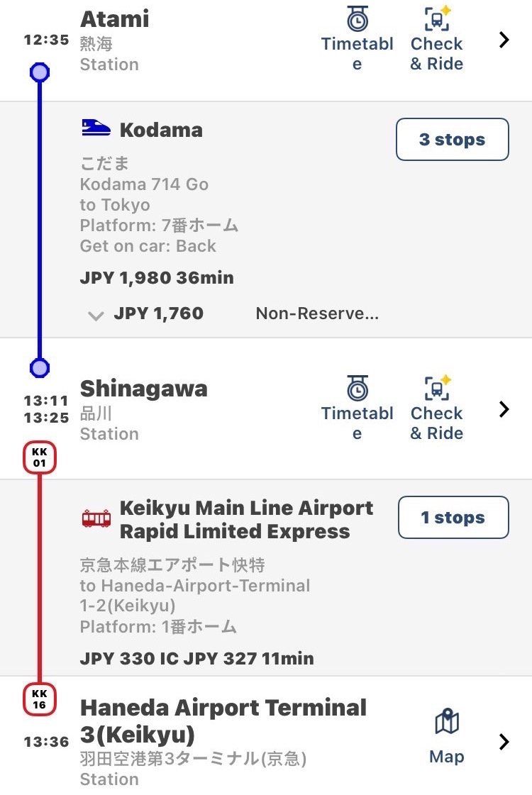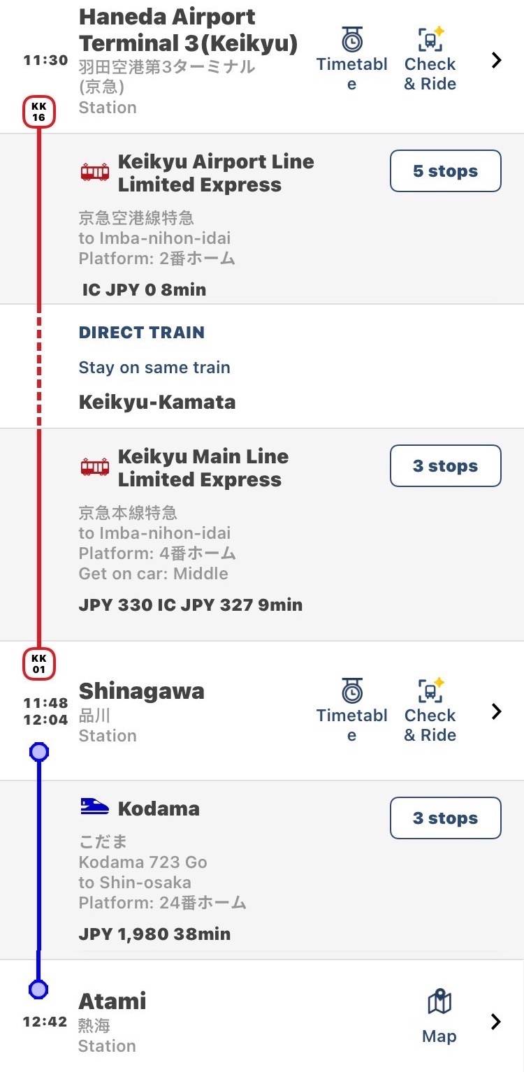 The times in this screenshot are an example. Allow yourself 35 minutes to get to Shinagawa station, 20 minutes to locate the Shinkansen ticket machine and buy your tickets, and 10 minutes to get to platform 24 for the Shinkansen.