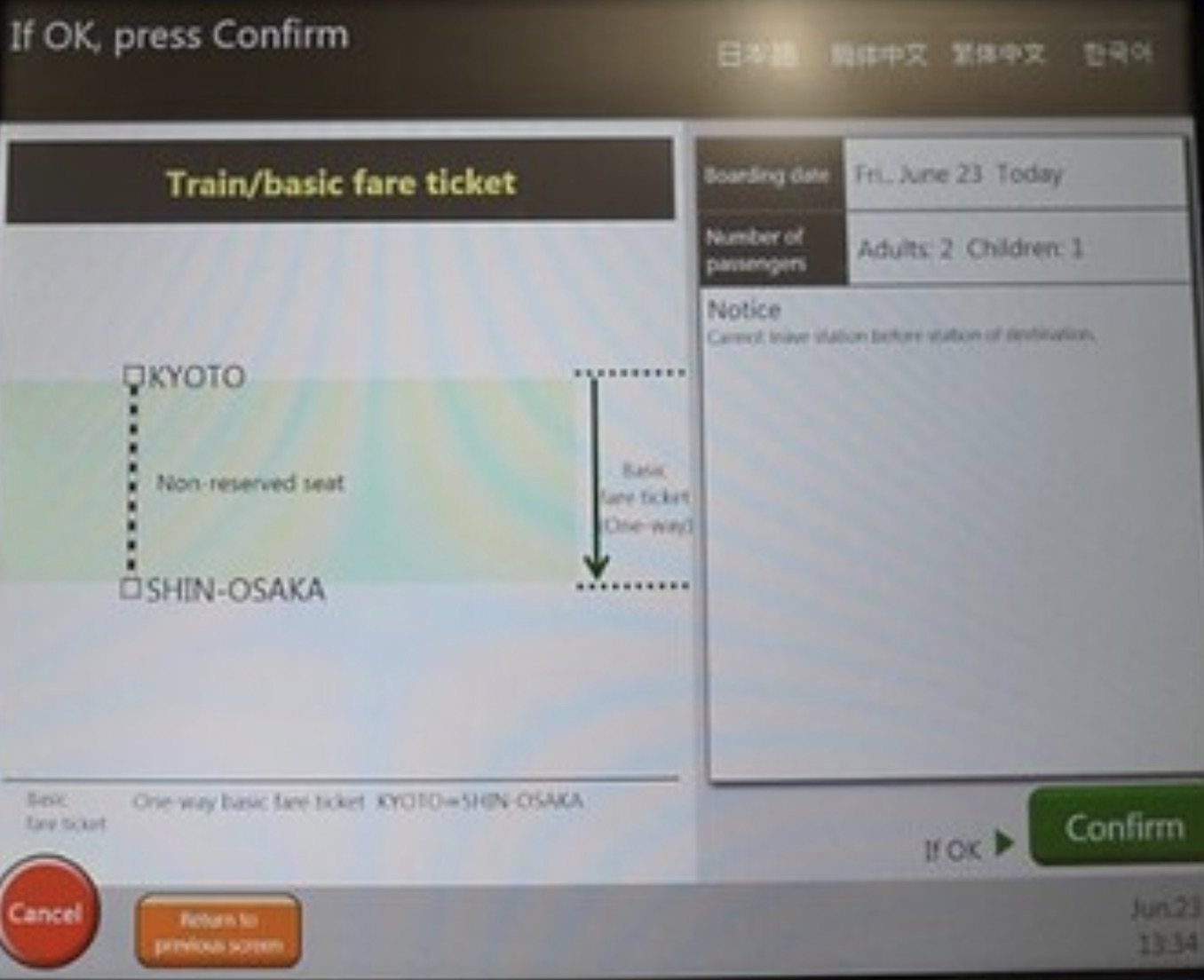 two-layer fare system (note 4): Before Shinkansen there were many popular express trains achieving modest speeds like 80 MPH. Japan Rail decided to allow people to purchase tickets for these existing trains, then "upgrade" their trip to the bullet train by purchasing an additional ticket. The decision to upgrade can be made later, offering customers greater flexibility. To ride a Shinkansen you have to have both tickets: one to go from A to B on any train, and another specifically for making that trip on a Shinkansen. Most people who already know they want Shinkansen will use a machine and get a single ticket attesting to both fares.