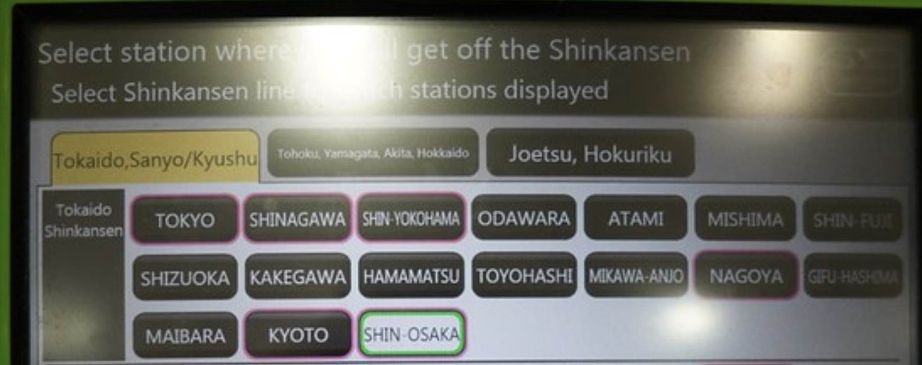 two-layer fare system (note 4): Before Shinkansen there were many popular express trains achieving modest speeds like 80 MPH. Japan Rail decided to allow people to purchase tickets for these existing trains, then "upgrade" their trip to the bullet train by purchasing an additional ticket. The decision to upgrade can be made later, offering customers greater flexibility. To ride a Shinkansen you have to have both tickets: one to go from A to B on any train, and another specifically for making that trip on a Shinkansen. Most people who already know they want Shinkansen will use a machine and get a single ticket attesting to both fares.
