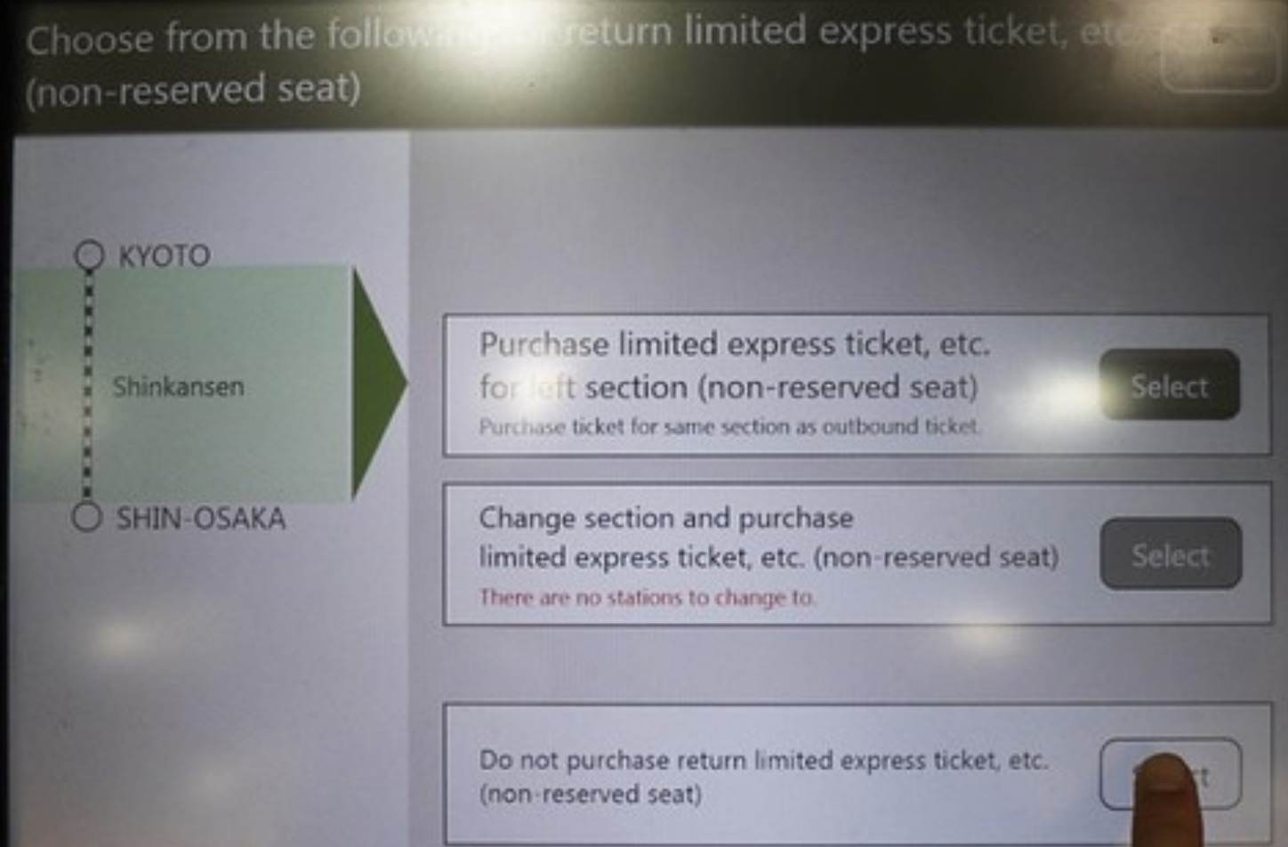Because there are two fares, at some point the machine asks you to "Select a base fare ticket" (or "basic fare"). This is required: do not opt to "purchase limited express ticket only". That's only for people who have a Japan Rail pass and want the bullet train upgrade (but all is not lost, see note 2).